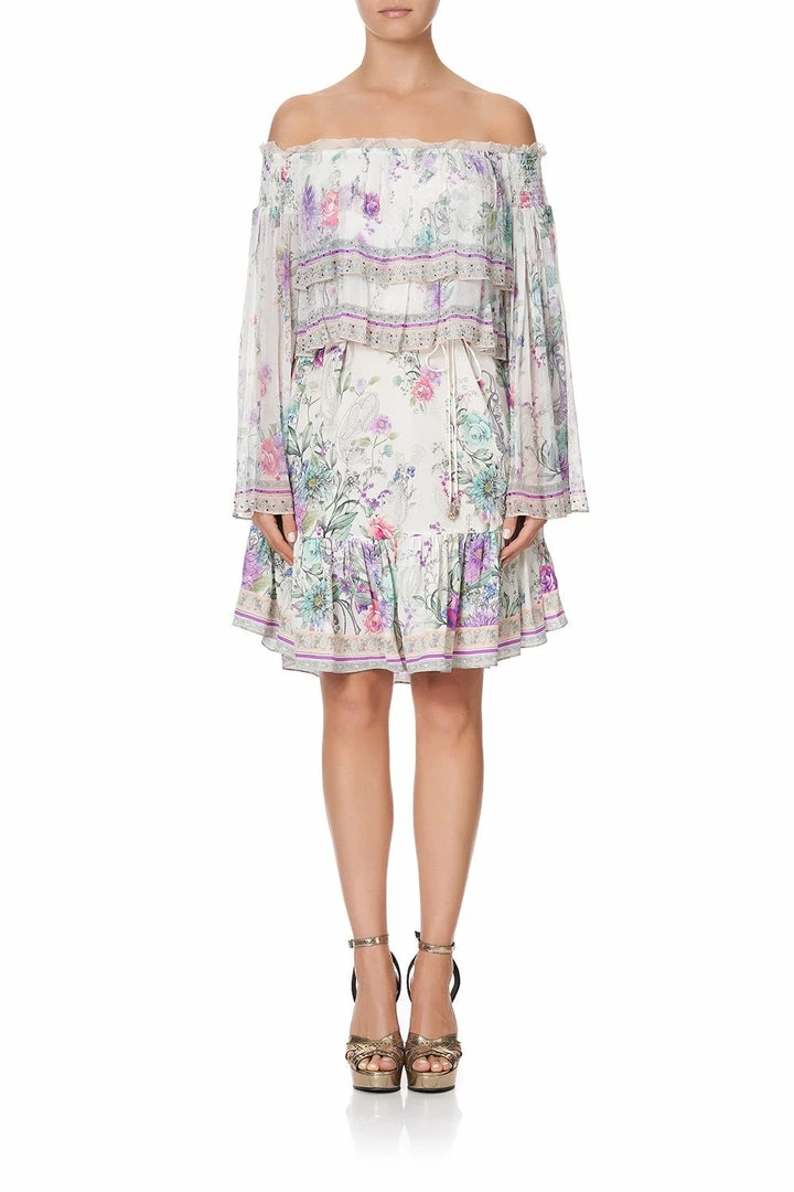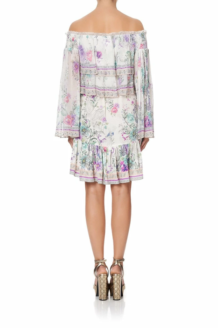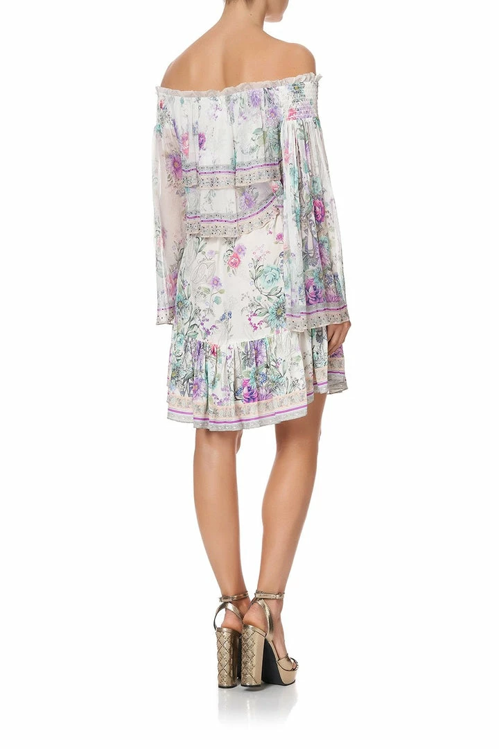Tumbling with playful ruffles, the Forever Far Tiered Ruffle Dress is a piece of pastel heaven. Crafted in floaty printed silk inspired by a bouquet of hand-painted florals bloom against a bohemian paisley backdrop, this mini dress features shirred shoulders for easy movement, 70s style peasant sleeves, a playful double bodice frill, a waist tie to accentuate form, and is finished with love hand-applied artisan CAMILLA crystals. A party dress for lovers of colour, pair with statement heels.