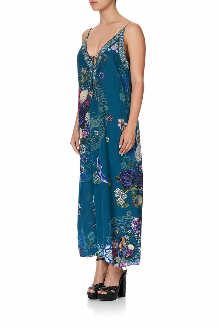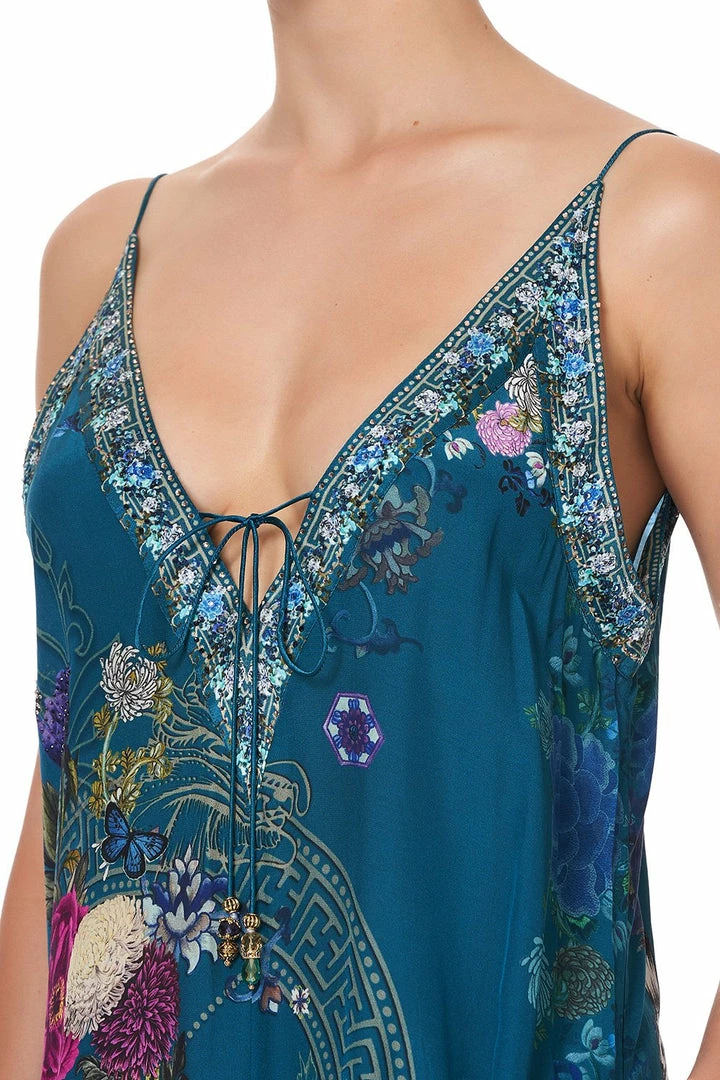 A simple slip dress reimagined with CAMILLA design; the Lunar Gazing V Neck Dress with Neckbands is effortlessly luxe personified. Crafted in a soft CAMILLA silk with a print chronicling the studies of zodiac tigers and Chinese folk florals, this mid-length emerald dress exhibits feminine shoestring straps, an alluring v-neckline, practical side pockets and is polished with hand-applied CAMILLA artisan crystals. An effortless dress to be worn day-to-night.