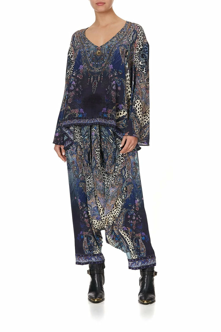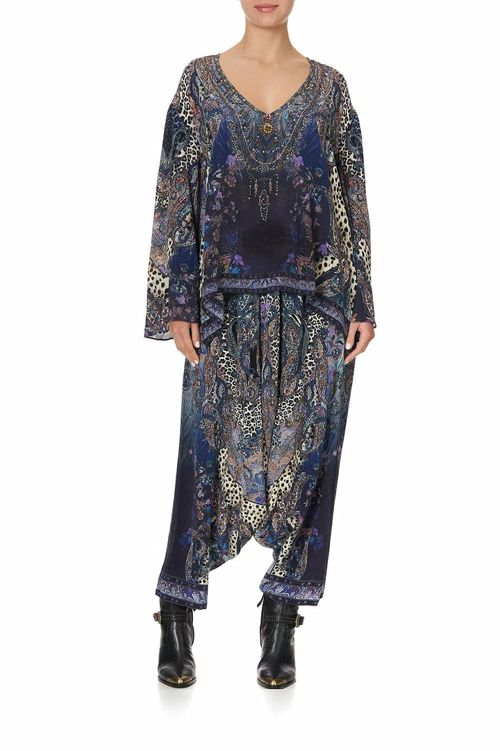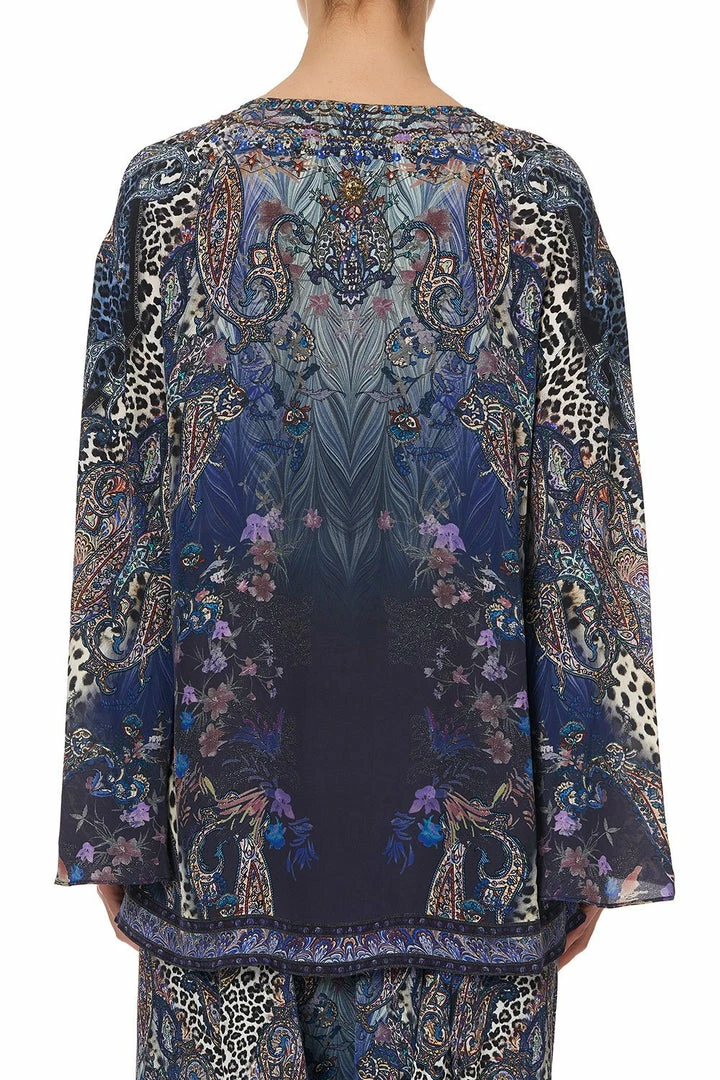 Decadent blue silk with enchanting animal print accents, the Festival Express V Neck A-Line Blouse is mused by Janis Joplin and made for those with hypnotic hearts that wear on their sleeves. Handcrafted in pure silk, this ethereal printed blouse features a drop shoulder detail, high low hem for a flattering effect, flared body and sleeves as well as all-over crystal embellishment for a heavenly finish.