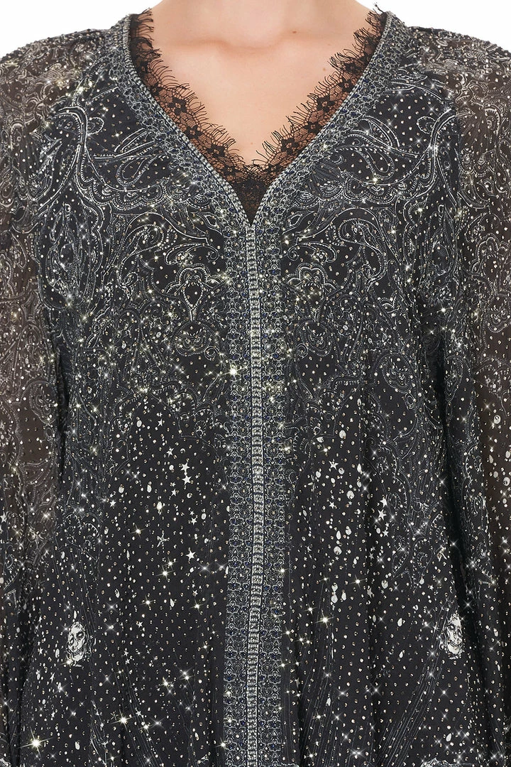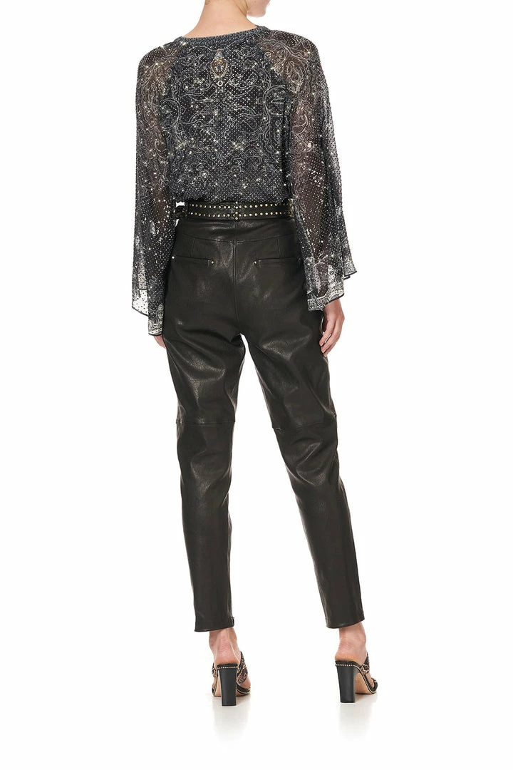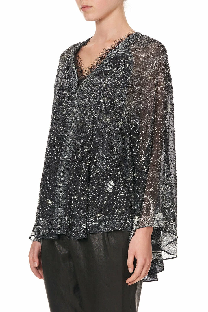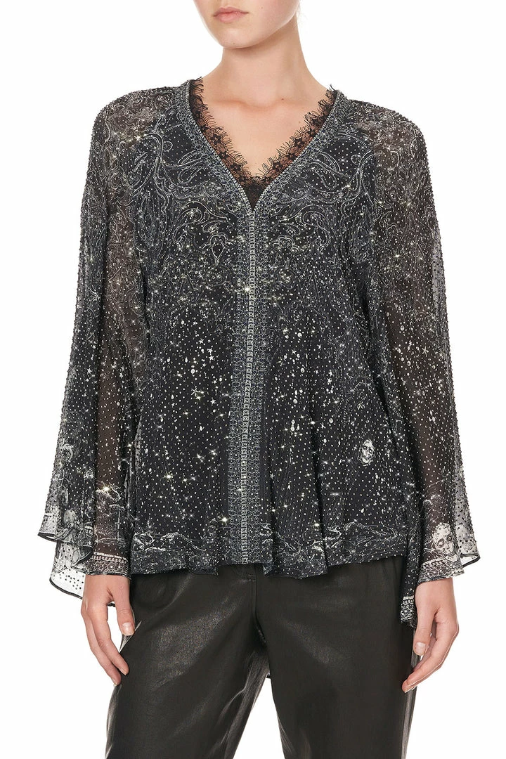 Nostalgic pirate patterns and crystal embellishments decadently weave their way through the pure silk styling of the Midnight Pearl V Neck Blouse With Neckband. Cut in a relaxed fit with flared body and raglan sleeves, the soft black silk is accented with white paisley detailing and all-over hand-applied CAMILLA crystals. For romantic summer dressing pair back with the Midnight Pearl Maxi Skirt With Double Frill or, for a more structured look, wear with the Studio 54 Leather Belted Trouser With Draped Side.