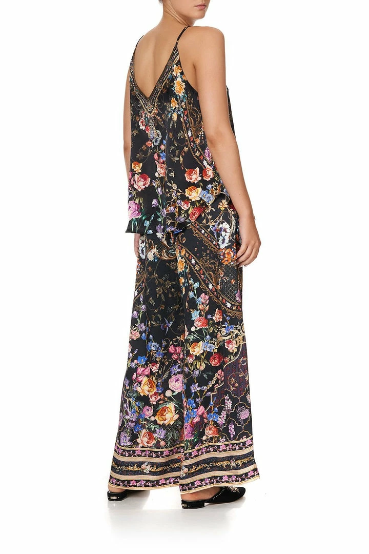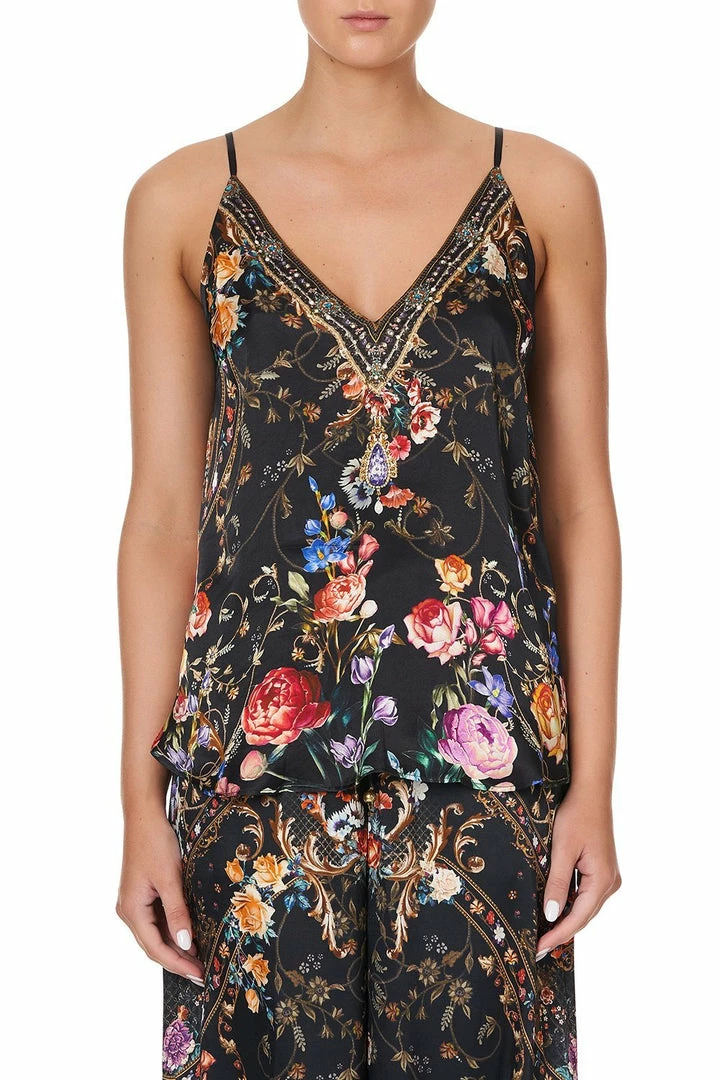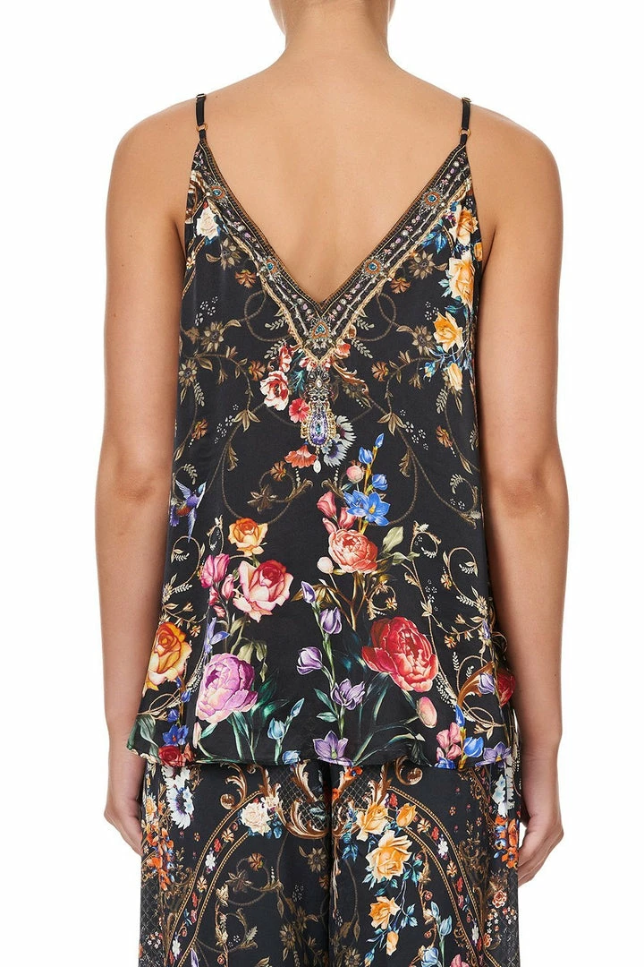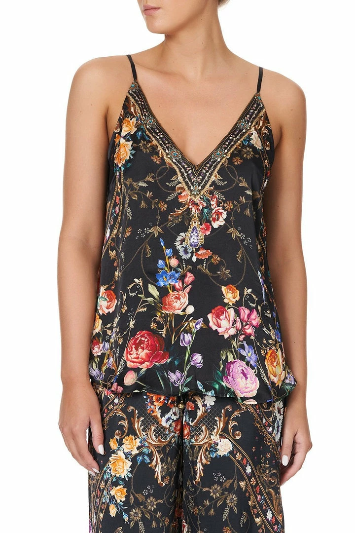 Elegant in form, feminine in design; the Blushing Manor V Neck Cami is a crystal embellished singlet style crafted from pure CAMILLA silk and decorated with a posy of vibrant perennials. Inspired by a wild English rose this silk top is cut in a stylish relaxed fit with V-neck, bust darts and adjustable shoestring straps. Enchanted by nightfall, the black canvas offers a rich contrast to the vibrant floral design. This versatile silk cami pairs beautifully with the matching Blushing Manor Straight Leg Pant for an effortlessly chic look that will take you from desk to dance floor.
