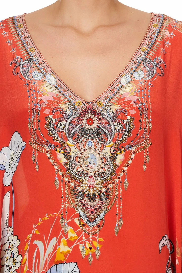 Blooming across the coral red canvas of the Paisley In Patches V-Neck Kaftan, a collage of haberdashery and horticulture grows in striking harmony with pastel paisley accents. Lovingly cultivated in a relaxed resort silhouette, this pure silk kaftan dress is designed with ¾ length sleeves and a V neckline. With rich and intricate detailing, inspired by a florist’s notes from the greenhouse, this full-length kaftan is a conversation starter that dazzles with colourful crystal embellishment along the neckline. A true vision of resort wear styling, swan about in this piece post swim or wear with statement accessories for a formal event.