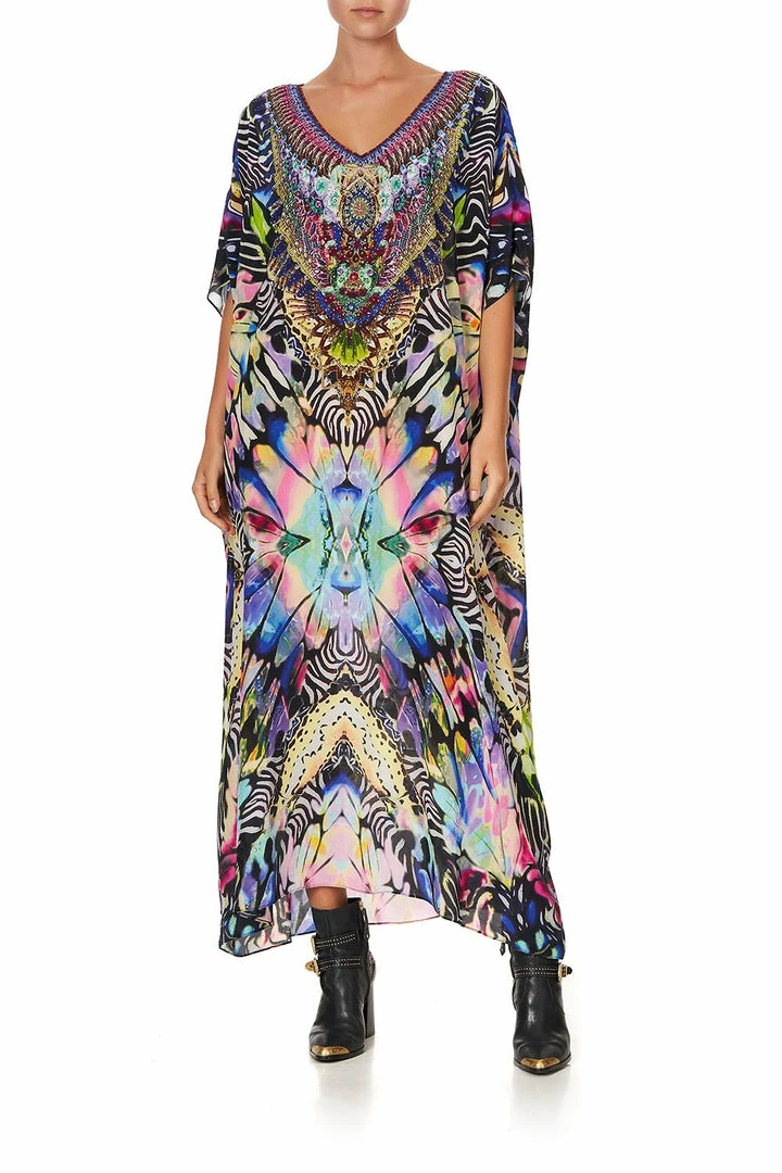 Rich with a euphoric ecstasy of colour and print, the Trance Temptation V-Neck Kaftan is a technicolour reimagining of a classic CAMILLA silhouette, inspired by the hallucinating heiresses of the Mad Manor. Designed in a maxi dress length with ¾ length sleeves, this relaxed fit resort wear kaftan is styled with a signature CAMILLA crystal embellished V neckline. Style this pure silk multi-wear kaftan dress in a myriad of ways; visit the CAMILLA style guide for inspiration.