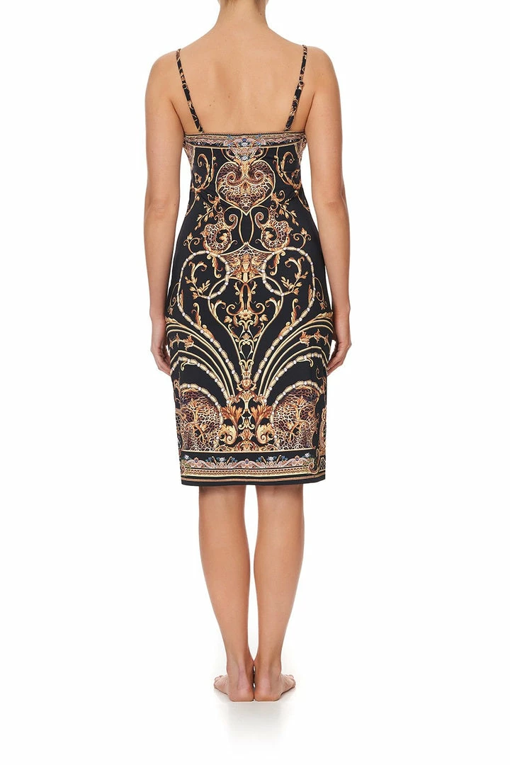 A slinky statement mini dress or a bejewelled layering piece, the Studio 54 V Neck Slip is simplistic opulence. Crafted with a soft midnight black fabric honouring studies of Grace Jones and her unapologetic attitude in carving out her own unique style. This daring slip features a printed neckline and back detail, side bust gathering for optimal fit and adjustable convertible straps. Styling solo or layer under kaftans and resort wear dressing for a layer of luxe warmth.