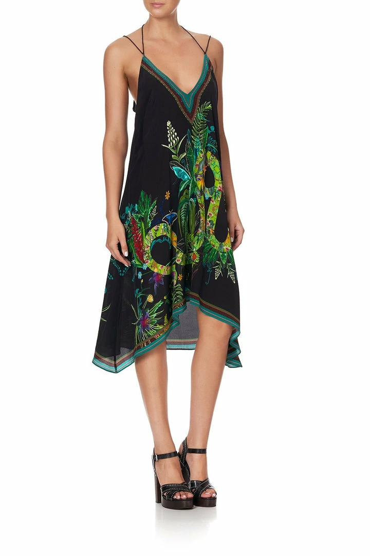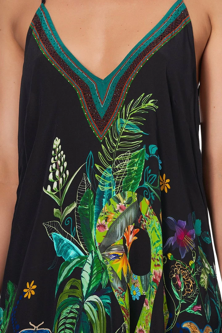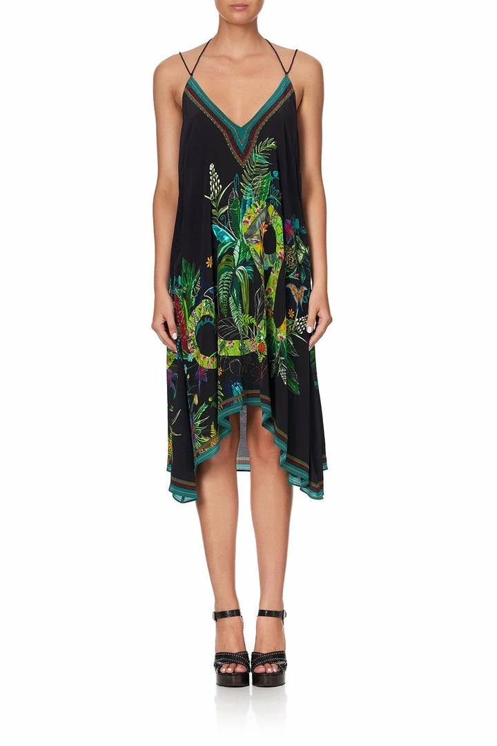A divine celebration of the Daintree River at dusk, the River Cruise V-Neck Strappy Flare Dress is every bit ethereal. Crafted with a vibrant canvas of rainforest marvels, this whimsical statement dress dances with a free-flowing silk fabric cut to a high low hem, while hand-applied CAMILLA crystals offer a layer of luxe.