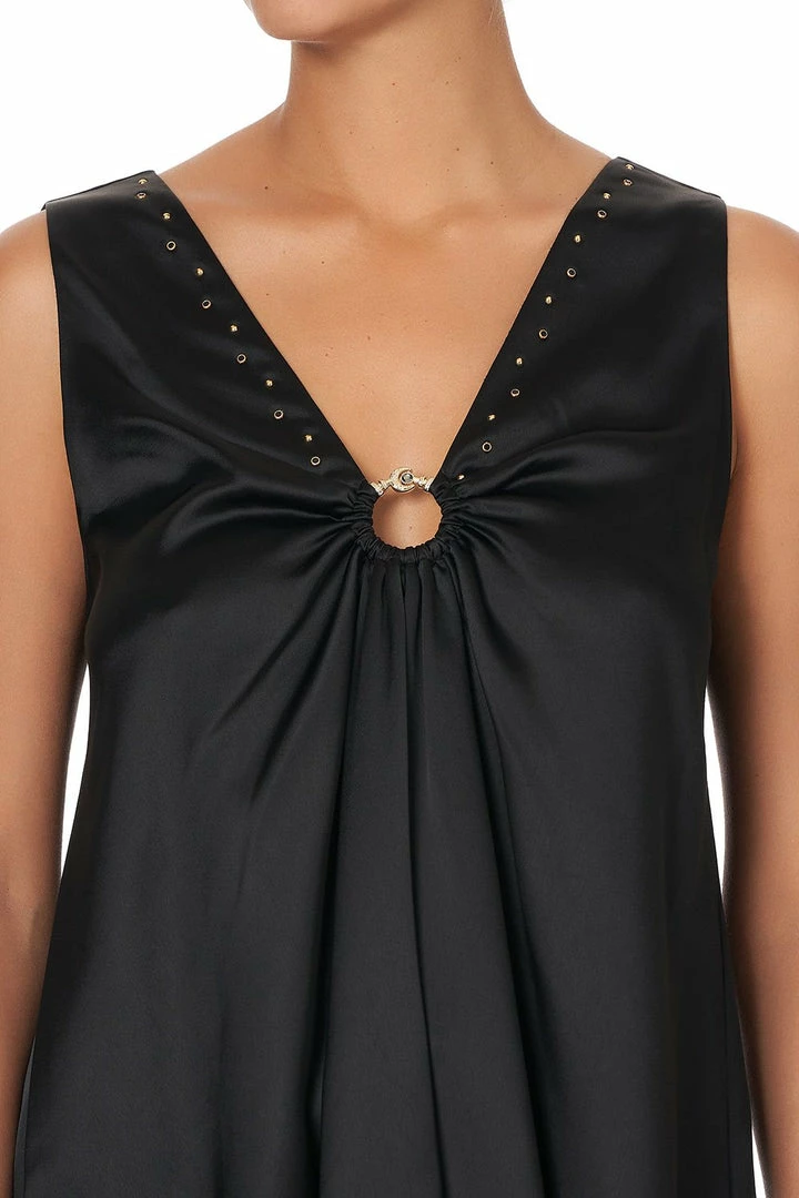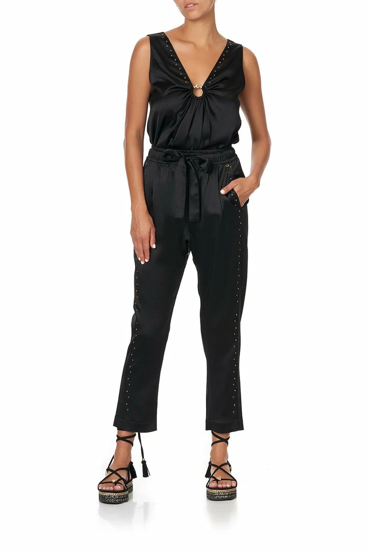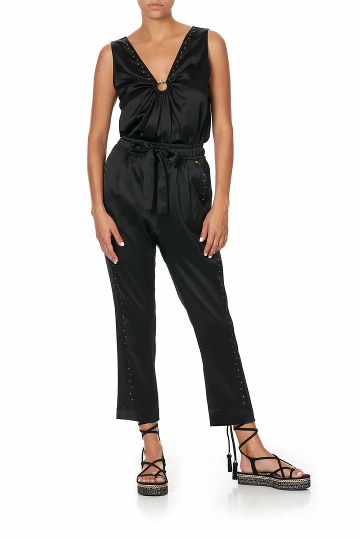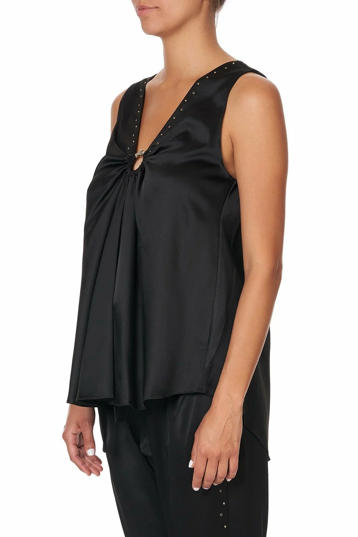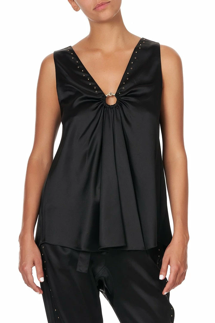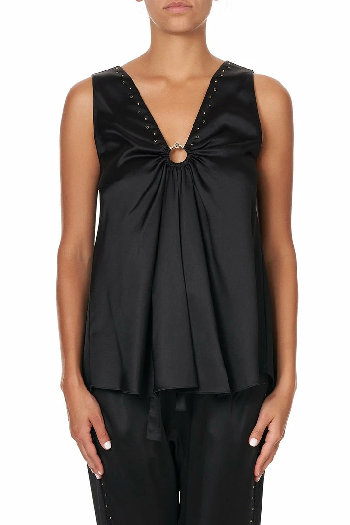 Simple and elegant in form, the Solid Black Wide Strap U-Ring Top pays homage to its pirate influence in a subtle and alluring manner. Stunning crescent moon hardware and shining stud embellishment emulate a night sky over a calm sea. Cut with a flared body and high-low hem, this understated cami style pairs back with the matching Solid Black Drop Crotch Slim Leg Pant for simplistic elegance.
