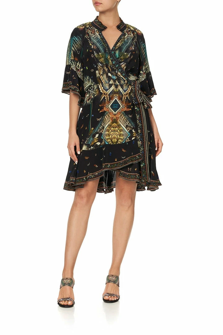 A dreamy boho statement dress with vibrant hues dancing across a canvas of Queensland’s Mother Nature, the Maternal Instinct Wrap Dress with Raglan Sleeve is simple bliss. This silk dress features an alluring button neckline, sumptuous wide sleeves with frill, kimono-style side tie, digitally printed silk, as well as delicate neckline crystals as detail. Wear open simply over swimwear for an effortless resort look, or wrap closed for an elevated summer outfit.